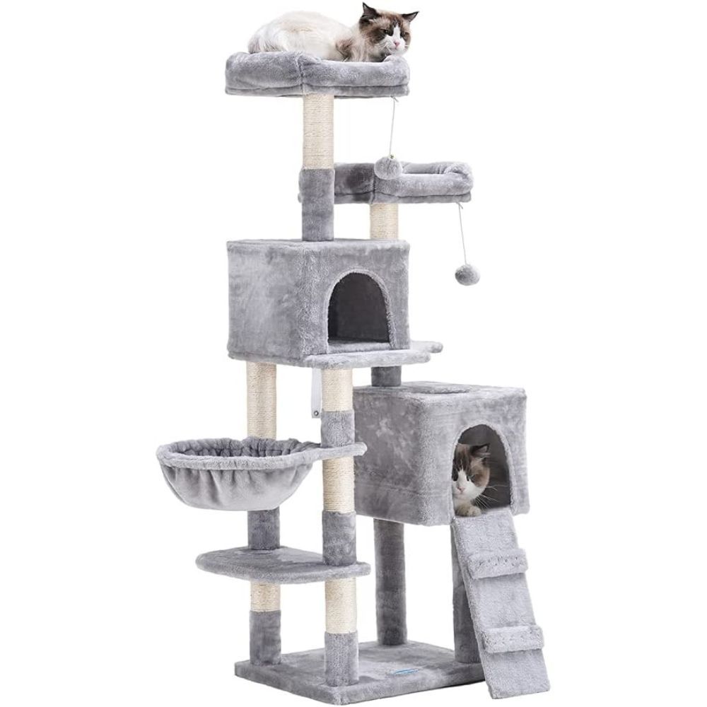 And with two spacious hideaway houses and plenty of lounging rooms, your kitties will have the ultimate sleeping accommodations. Plus, with sisal scratching posts, jingly balls, and plenty of layers for climbing, your cats will always have something fun to do.