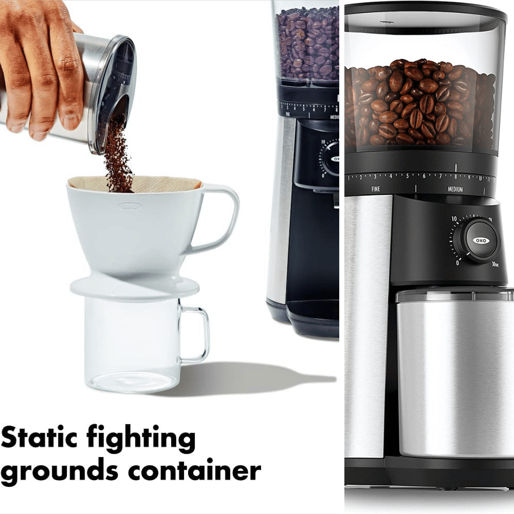 The grinding container is also anti-static, which is great because it means the grounds won't stick to the sides and make a mess. It has a capacity of 110 grams, which is enough for 12 cups, so you can make a big pot of coffee or enough for several days' worth of individual cups.